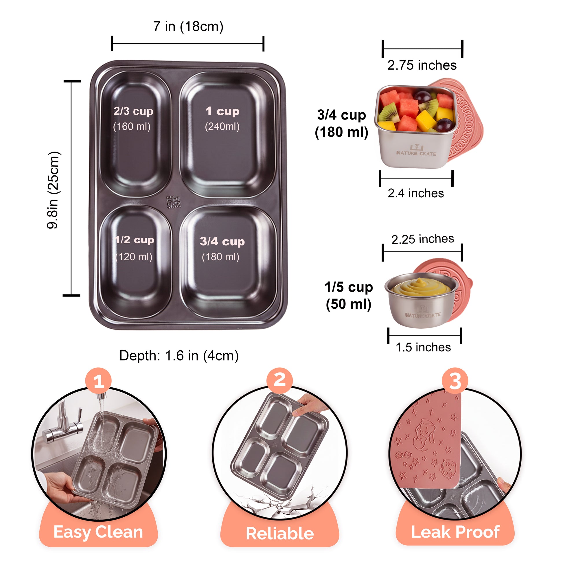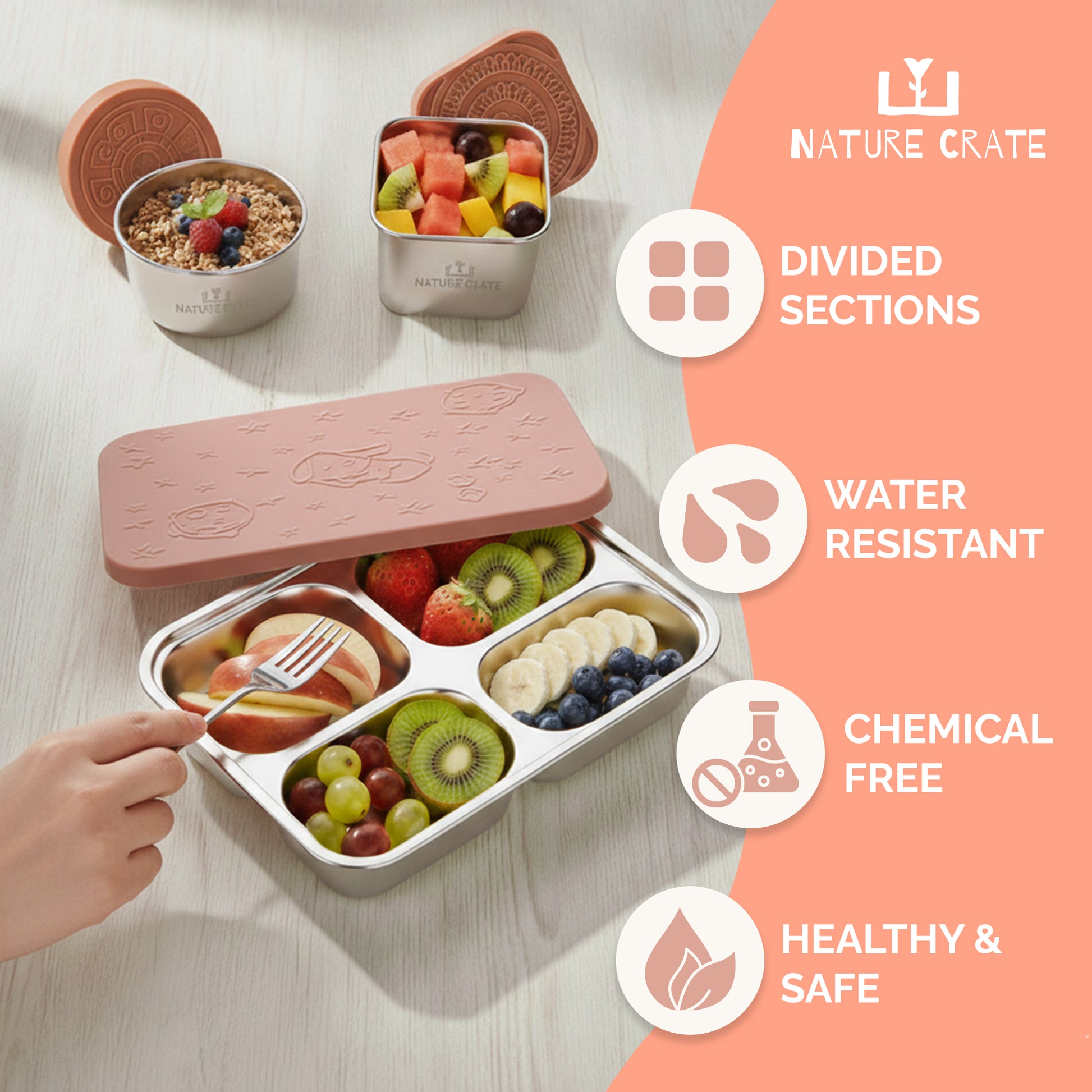 Nature Crate stainless steel bento box and snack containers are made from food-grade materials to keep your child’s food safe and help eliminate microplastics. The seamless design with no clasps, hinges, or seams makes these containers strong, durable, and ideal for everyday use. Each container includes a leak-proof silicone lid and a 1/5 cup sauce container to keep meals, sauces, and dips secure. Lightweight and easy to open, the design supports independent use for kids ages 3+, while the dishwasher-safe stainless steel resists odors and stains for easy cleanup.